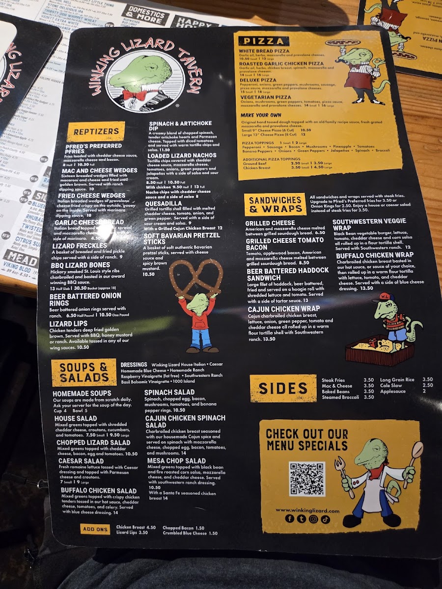 Welcome to Winking Lizard Washington Square, a hidden gem nestled in North Canton, Ohio. This vibrant eatery excels in delivering a cozy yet lively atmosphere, making it perfect for casual dining and game day excitement. With a menu brimming with enticing options, the Lizard Wraps are a standout, featuring the succulent Cajun Chicken Wrap and the bold Buffalo Chicken Wrap, both generously stuffed and paired with zesty dips.